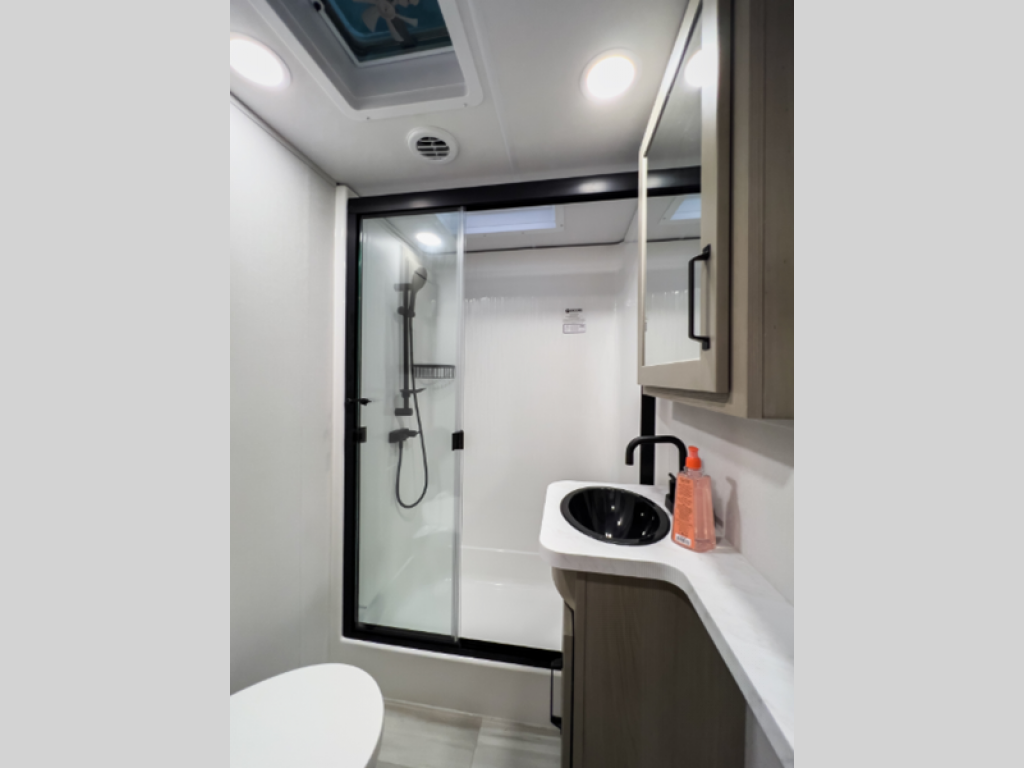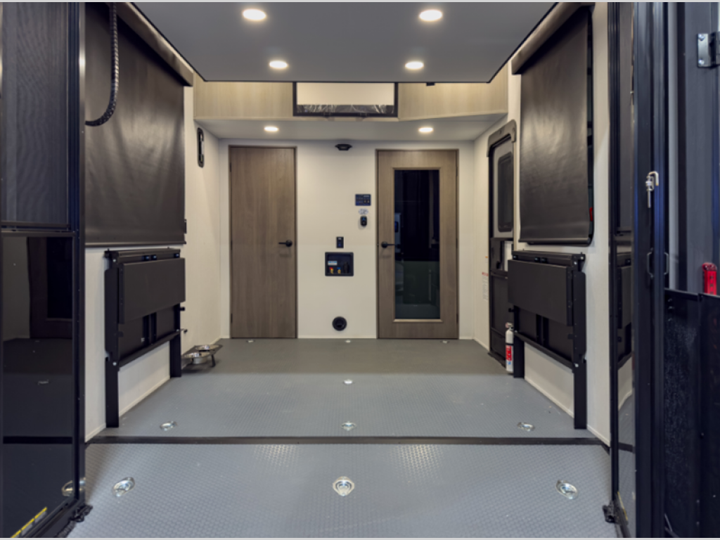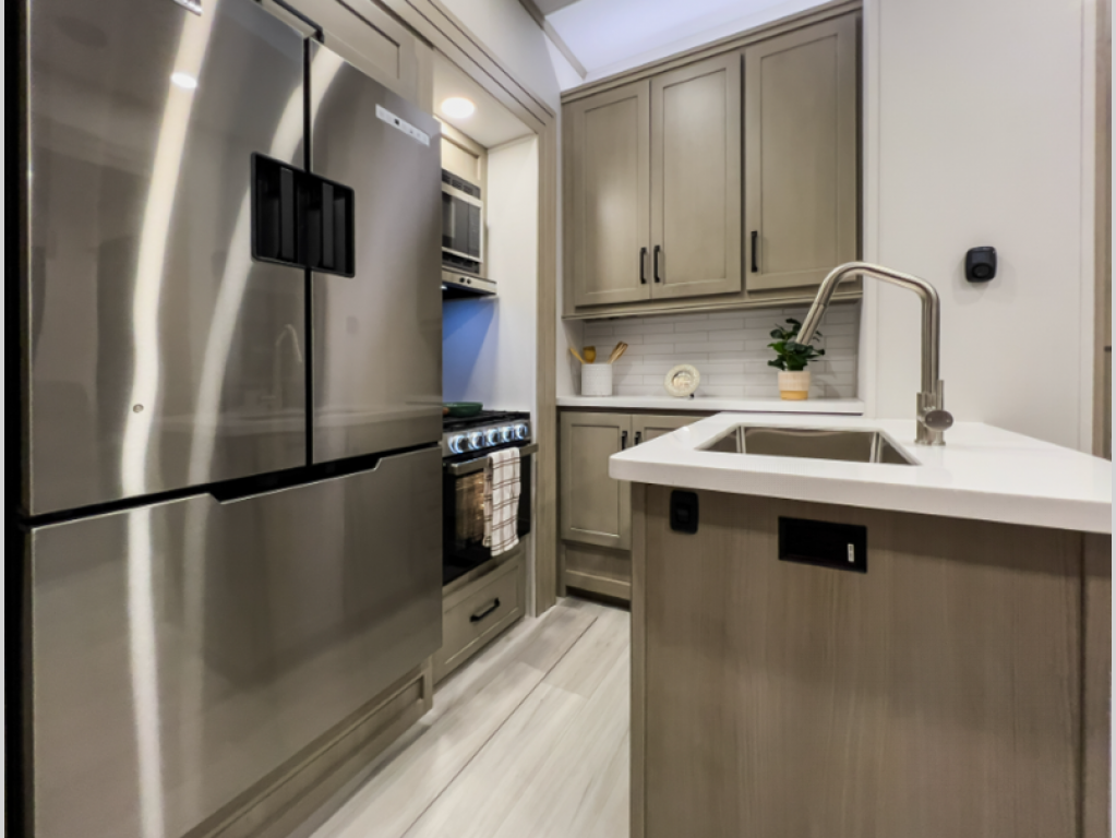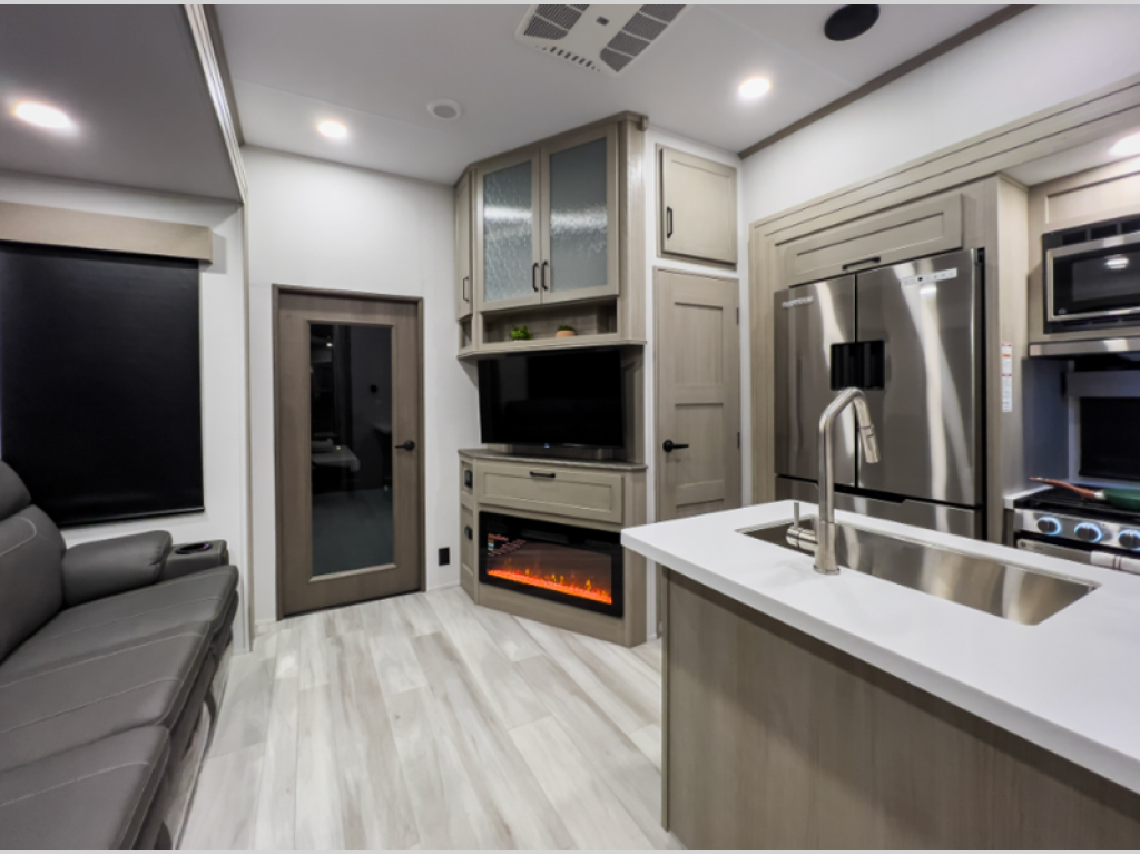 Each model also includes a universal docking center, a fiberglass front cap with paint and LED lighting, a heated and enclosed underbelly for four seasons of traveling, and a dovetail rear end. The Momentum G-Class also comes with large panoramic windows, residential cabinetry, motion-sensor lighting, and stainless steel-accented appliances. The fun will not stop when listening to the exterior speakers, and the awning with LED lighting will create an outdoor living space you are sure to love.