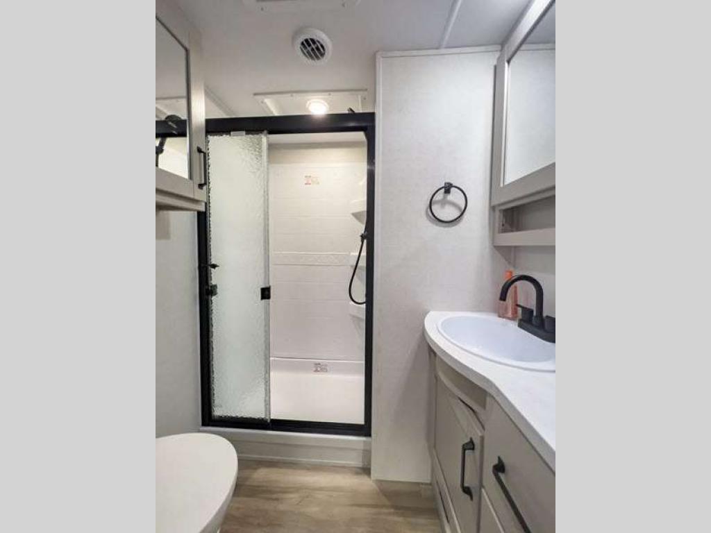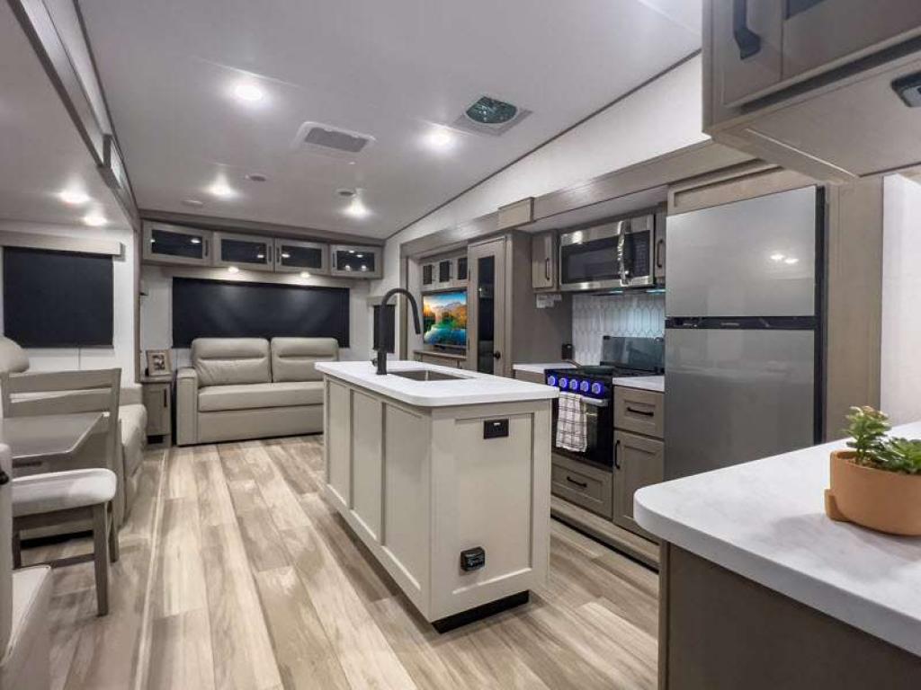 Sleeps 5 Slides 2 Length 32 ft 9 in Ext Width 8 ft Ext Height 12 ft 3 in Hitch Weight 1460 lbs GVWR 10995 lbs Dry Weight 9045 lbs Fresh Water Capacity 55 gals Grey Water Capacity 78 gals Black Water Capacity 39 gals Tire Size ST225/75R15LRE Available Beds Queen Refrigerator Type 12V Refrigerator Size 10 cu ft Cooktop Burners 3 Shower Size 30" x 36" Number of Awnings 2 LP Tank Capacity 30 lbs Water Heater Type On Demand Tankless AC BTU 15000 btu TV Info LR 40" LED HDTV Awning Info 10' 6" & 13' 6" One Touch Electric w/LED Lights Axle Count 2 Number of LP Tanks 2 Shower Type Walk-In Shower Electrical Service 50 amp Similar Floorplans