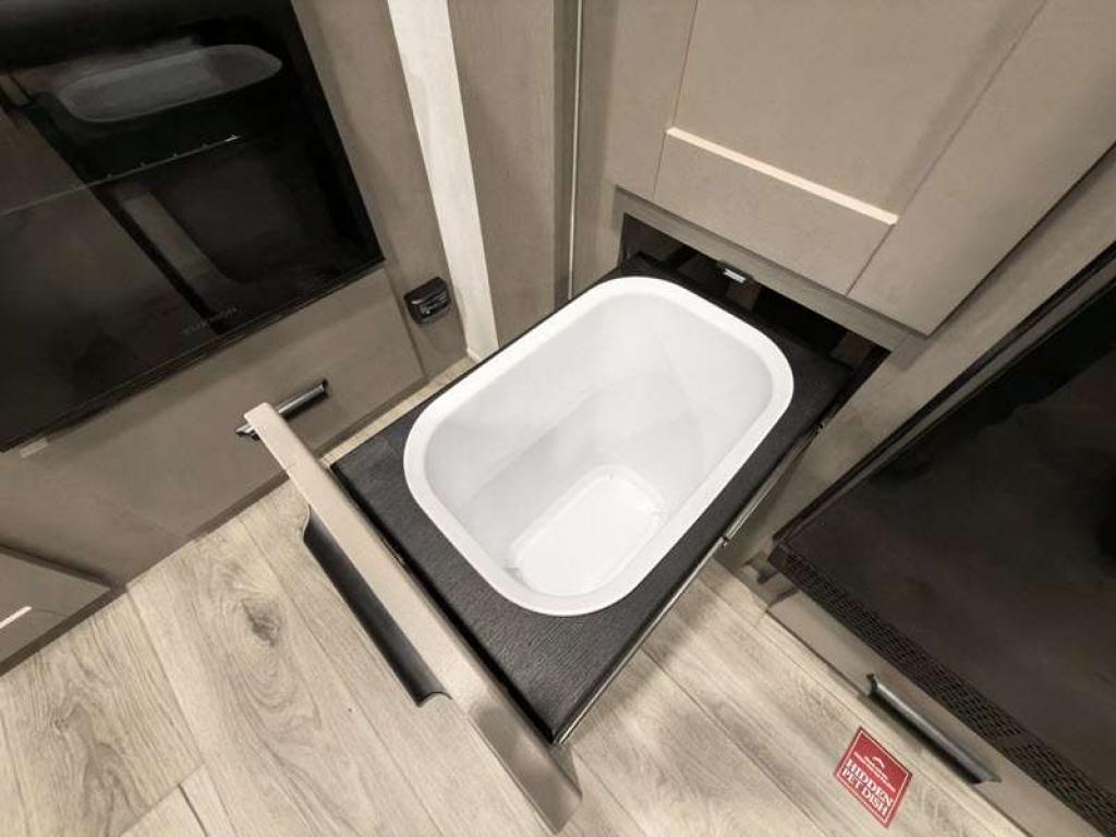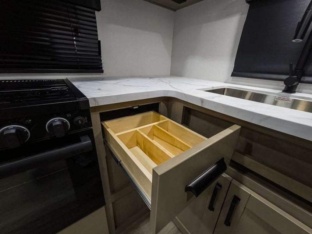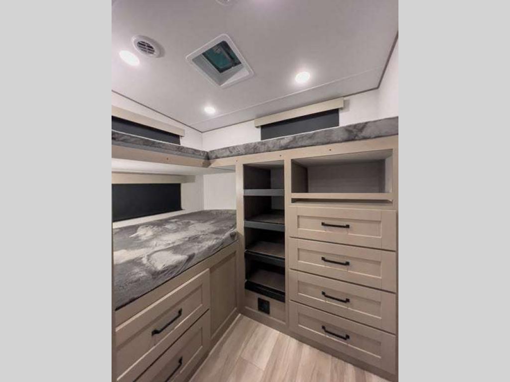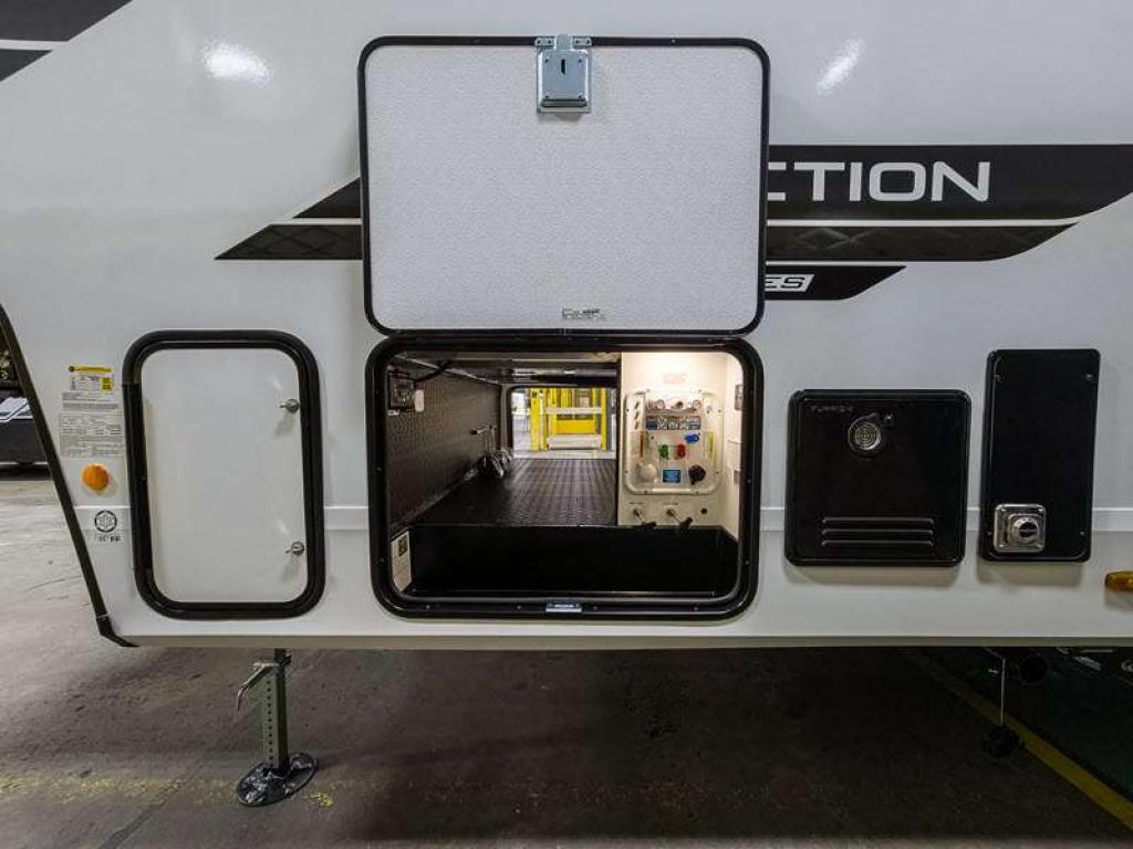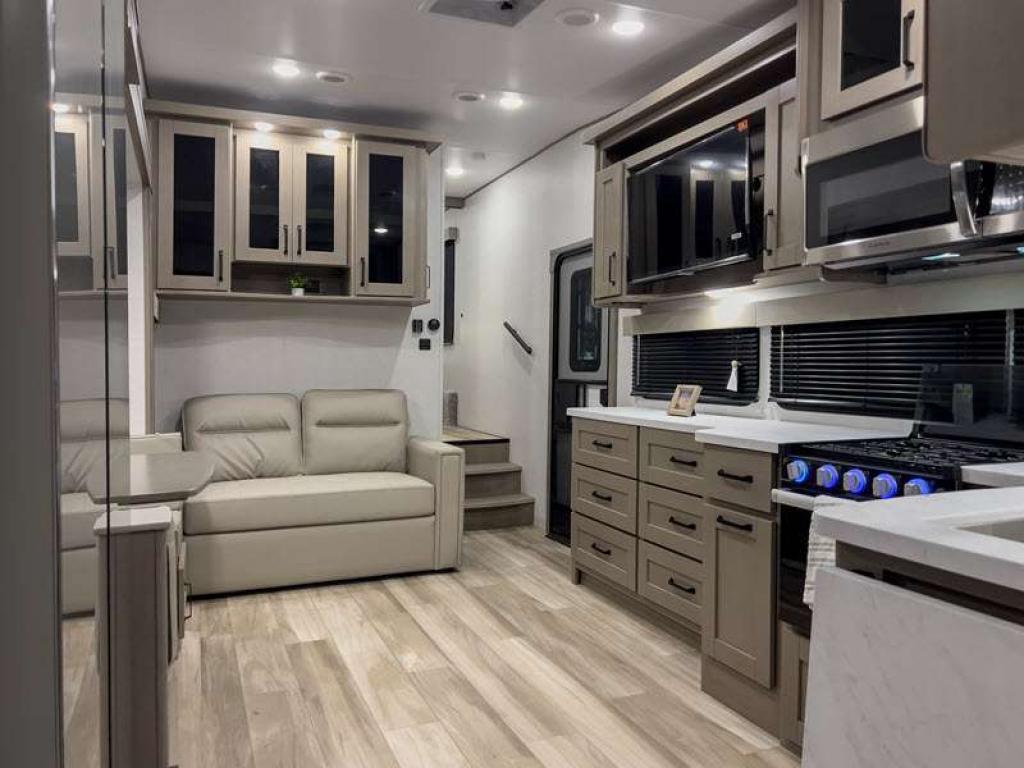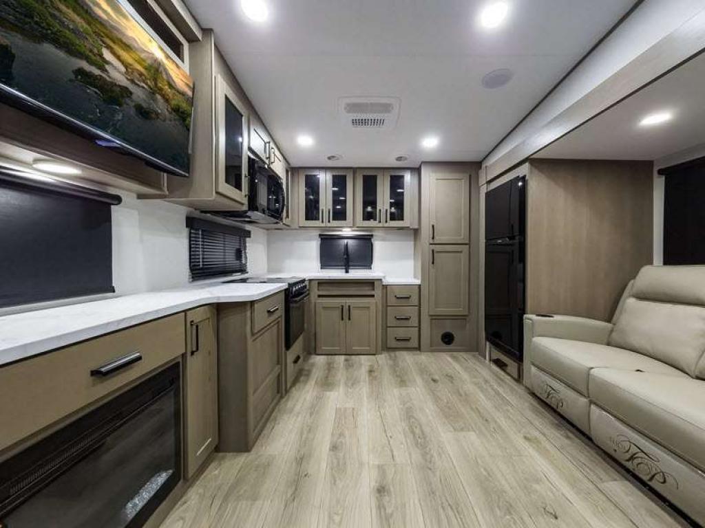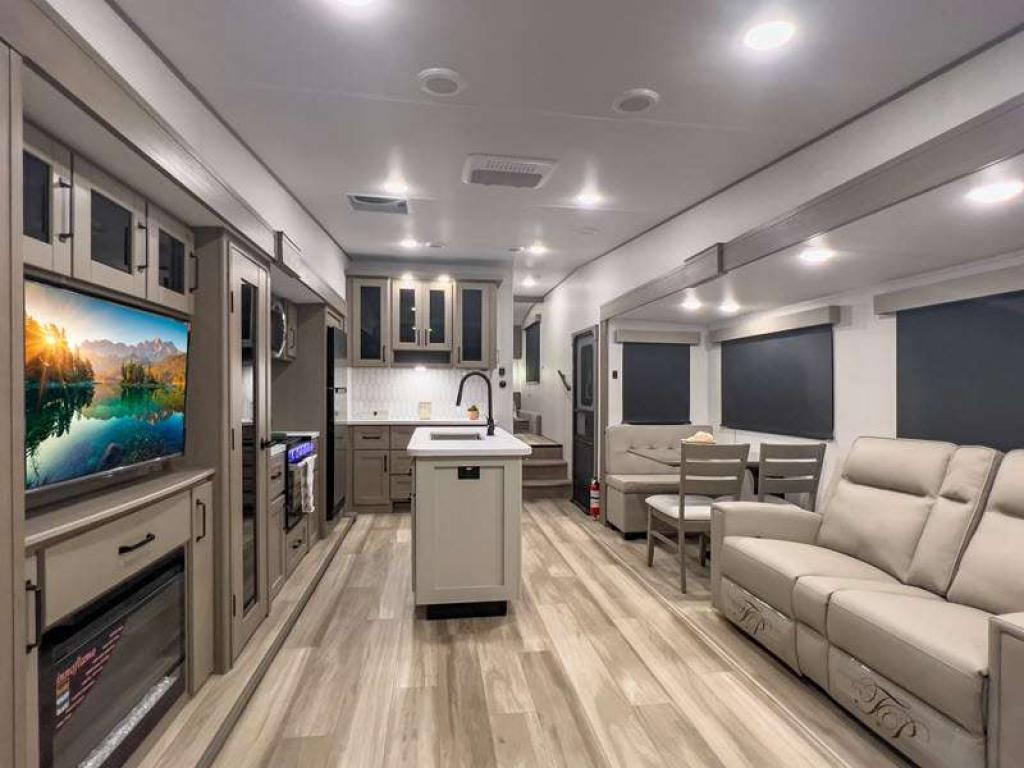 Each fifth wheel has 90-degre turning radius capabilities which allows you to be comfortable driving in town and parking into your campsite. Some construction and Arctic 4-Seasons Protection package features include a one-piece TPO roof membrane, a heated and enclosed underbelly with circulating heat, 12V heat pads on the holding tanks, and a heated pass-through storage area so you can travel and enjoy any climate. The interior offers large panoramic slide room windows for great views, premium Congoleum flooring for durability, and an On Demand water heater.
