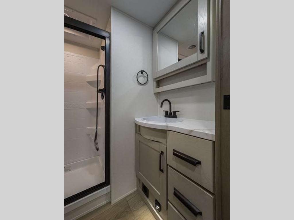 Sleeps 3 Slides 1 Length 29 ft 9 in Ext Width 8 ft Ext Height 12 ft Hitch Weight 1260 lbs GVWR 9995 lbs Dry Weight 8220 lbs Fresh Water Capacity 55 gals Grey Water Capacity 78 gals Black Water Capacity 39 gals Tire Size ST225/75R15LRE Available Beds Queen Refrigerator Type 12V Refrigerator Size 10 cu ft Cooktop Burners 3 Shower Size 30" x 36" Number of Awnings 1 LP Tank Capacity 30 lbs Water Heater Type On Demand Tankless AC BTU 15000 btu TV Info LR 40" LED HDTV Awning Info 17' One Touch Electric w/LED Lights Axle Count 2 Number of LP Tanks 2 Shower Type Walk-In Shower Electrical Service 50 amp Similar Floorplans