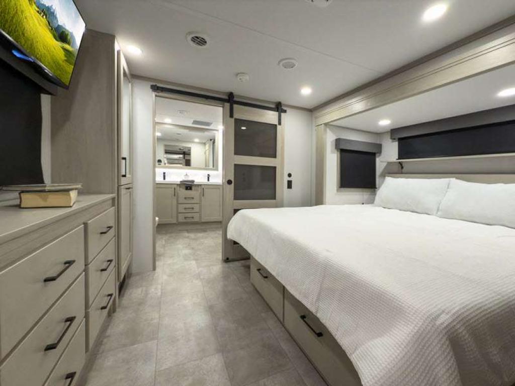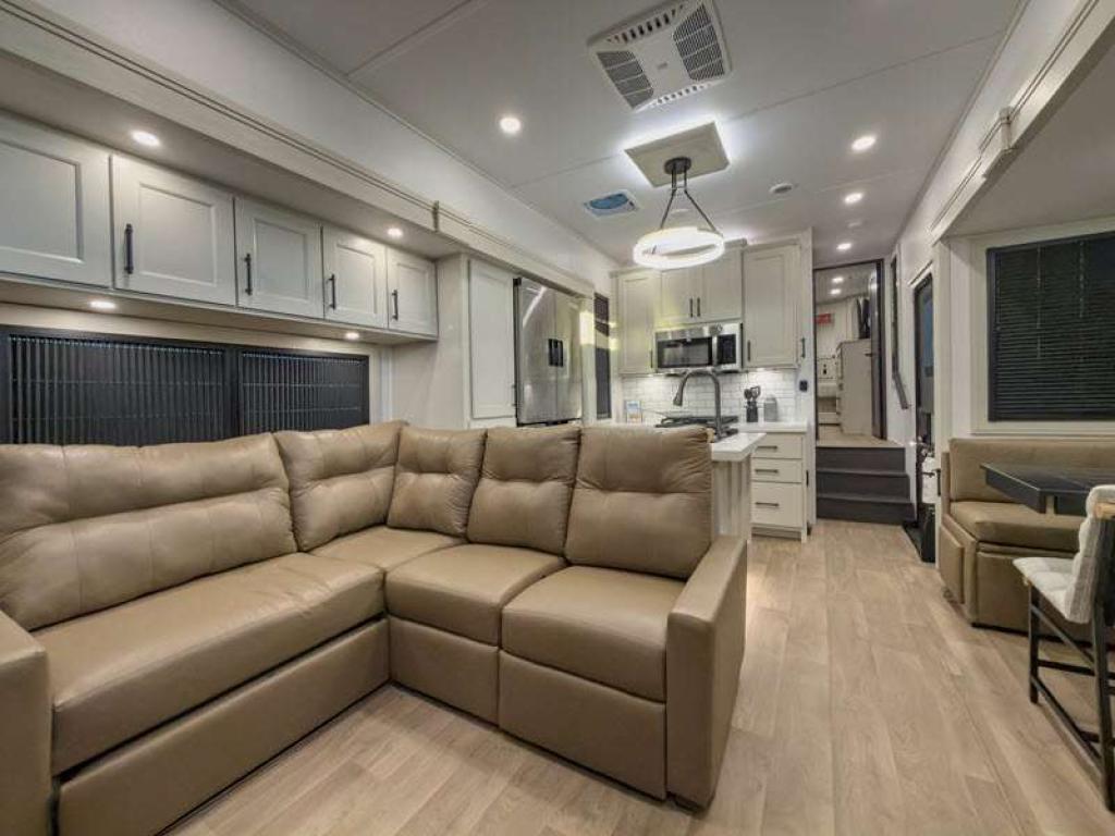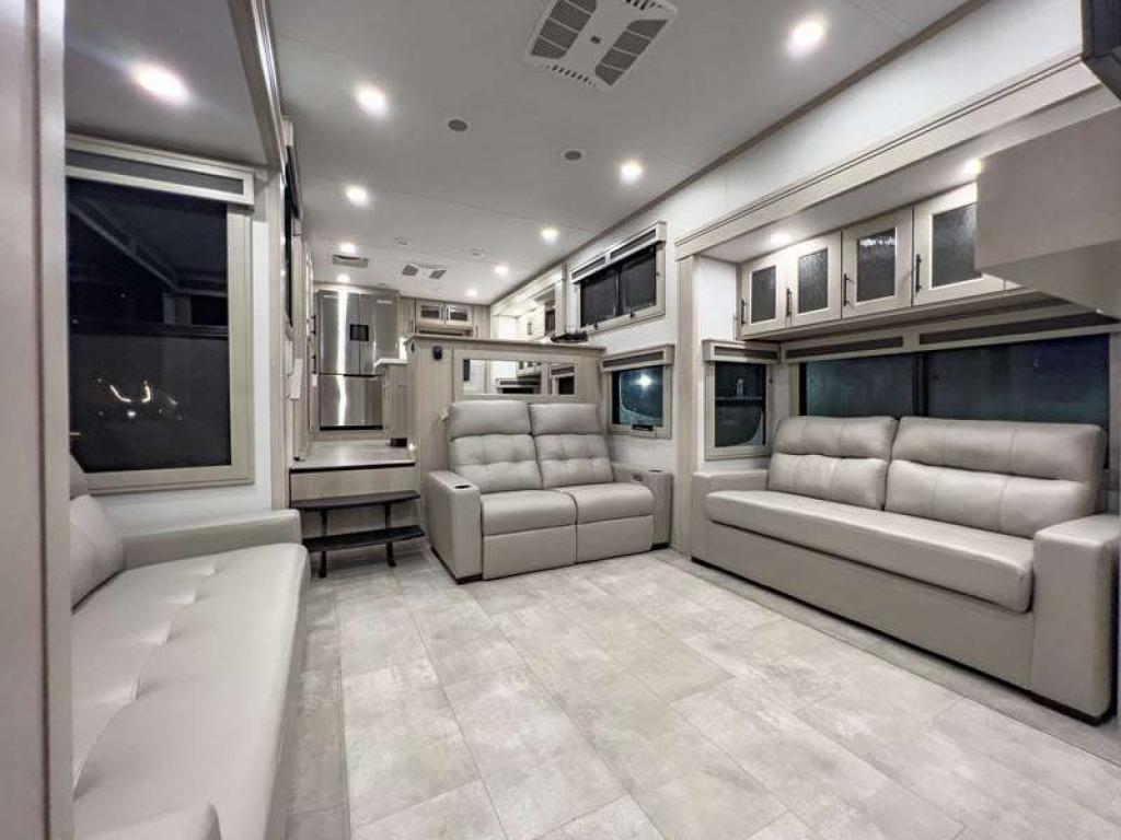 Sleeps 6 Slides 4 Length 34 ft 4 in Ext Width 8 ft 5 in Ext Height 13 ft 5 in Int Height 8 ft 1 in Exterior Color Standard Graphics or Aurora, Midnight, Pearl Full-Body Paint Options Hitch Weight 3200 lbs GVWR 23500 lbs Dry Weight 1900 lbs Fresh Water Capacity 83 gals Grey Water Capacity 159 gals Black Water Capacity 106 gals Tire Size ST215/75R 17.5 LRH Furnace BTU 35000 btu Number Of Bunks 2 Available Beds Queen Refrigerator Type Stainless Steel Refrigerator Size 20 cu ft Cooktop Burners 3 Shower Size 60" x 30" Number of Awnings 3 Axle Weight 8000 lbs LP Tank Capacity 30 lbs. Water Heater Type Tankless On Demand AC BTU 30000 btu TV Info LR LED 50" Smart TV, BR 40" TV, BNKRM 40" TV, EXT 50" TV Awning Info 15’ 5”, 7’ and 15’ 5" Power w/Integrated LED Lighting Axle Count 2 Number of LP Tanks 2 Shower Type Tub/Shower Combo Electrical Service 50 amp Similar Floorplans