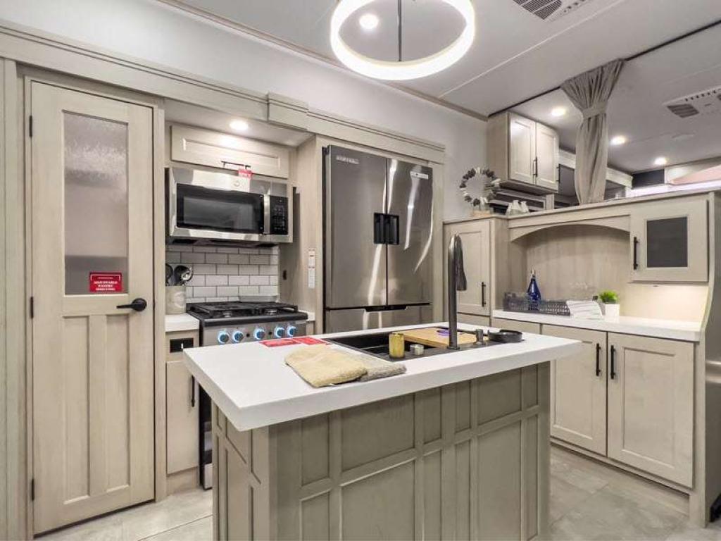 Each is built on a 101" wide body drop-frame super chassis, and includes the MORryde pin box system that utilizes a unique rubber shear spring to positively deal with rough towing and road shock. Some standard features that stand out include the chef-inspired professional grade stainless steel cooktop and Smart sink with a removeable cutting board, produce strainer and glass rinser, and the on-demand water heater with a whole house water filtration system. There is also an all-in-one enclosed and heated utility center to enjoy four seasons of camping, plus many more comforts.