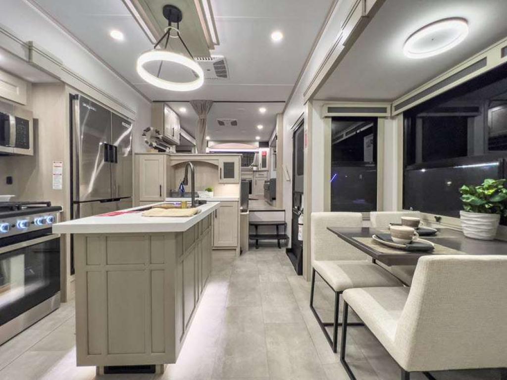 Sleeps 6 Slides 5 Length 41 ft 4 in Ext Width 8 ft 5 in Ext Height 13 ft 5 in Int Height 8 ft 1 in Exterior Color Standard Graphics or Aurora, Midnight, Pearl Full-Body Paint Options Hitch Weight 3052 lbs GVWR 19000 lbs Dry Weight 15000 lbs Fresh Water Capacity 83 gals Grey Water Capacity 106 gals Black Water Capacity 106 gals Tire Size ST215/75R 17.5 LRH Furnace BTU 35000 btu Available Beds Queen Refrigerator Type Stainless Steel Refrigerator Size 20 cu ft Cooktop Burners 4 Shower Size 48" x 30" Number of Awnings 2 Axle Weight 8000 lbs LP Tank Capacity 30 lbs. Water Heater Type Tankless On Demand AC BTU 30000 btu TV Info LR LED Telescoping Smart TV Awning Info 14' 5" and 15' 5" Power w/Integrated LED Lighting Axle Count 2 Washer/Dryer Available Yes Number of LP Tanks 2 Shower Type Shower w/Seat Electrical Service 50 amp Similar Floorplans