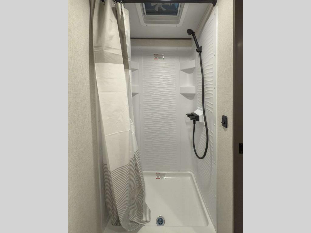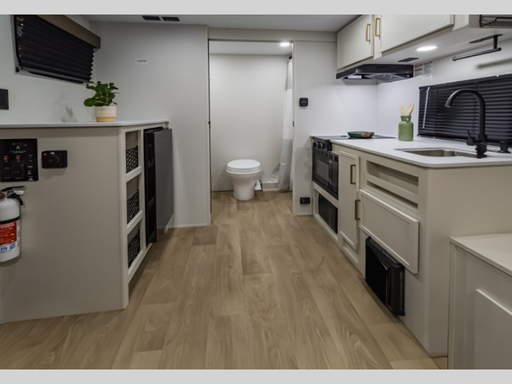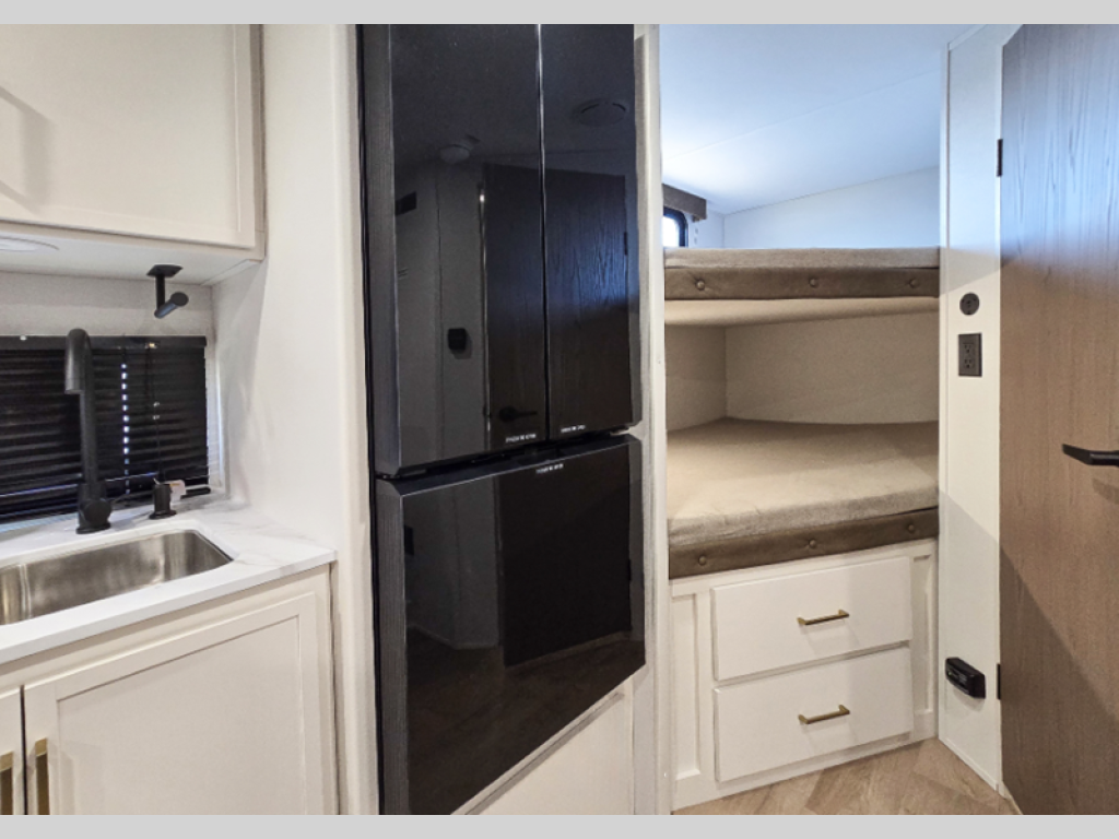 Each model is constructed to a superior standard with an insulated floor and enclosed underbelly plus residential insulated walls that will help with temperature regulation and moisture control. The 6' 6" interior height, tinted windows, and residential cabinet doors will make your space feel a little more like home, and the black automotive glass entry door is ultra sleek. You will find a power awning with a Fusion light outside, along with magnetic storage door catches, a Leash Link/bottle opener, and more convenient features!
