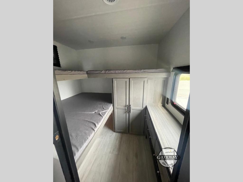 If you enjoy camping with extra friends and family, this travel trailer will be perfect for you! There is a rear bunkhouse with triple bunks, a dresser, plus a closet, making this room perfect for guests. Up front you'll find the private bedroom with a queen bed, dual nightstands and dual closets for your things, and the full bath is close by for convenience. The chef of your group will have a cooktop to prepare meals, ample counter space, plus a pantry for dry goods and snacks. Your crew can play a game at the booth dinette or relax on the sofa while dinner is being made, or they can relax outdoors under the 16' power awning!