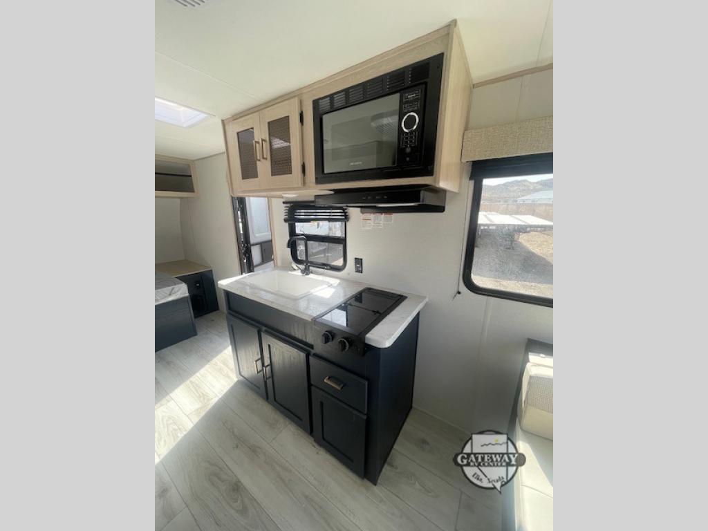 Camping with your friends or family doesn't have to be hard! This easy-to-tow, store and clean up RV allows two to four people to sleep comfortably on the U-shaped dinette along the rear wall with a large window and the front bed with nightstand. The kitchen includes a 10.7 cu. ft. 12V refrigerator, a microwave, plus a two-burner cooktop for preparing meals just like you do at home.