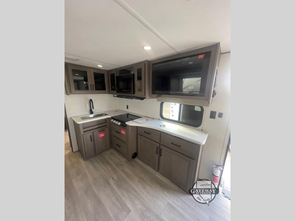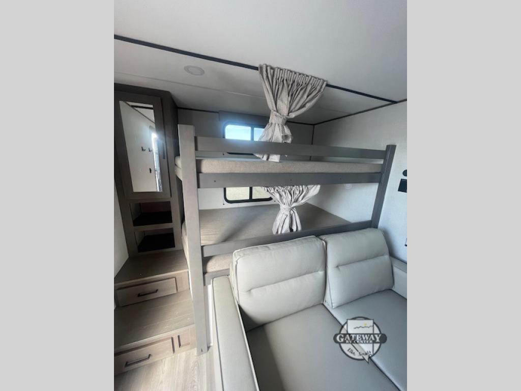 Your crew of eight will love camping in this spacious travel trailer! There are double-size bunks in the back with step storage and an added wardrobe for your guests' things plus exterior storage for camp gear galore. A walk-thru bath will create a front master bedroom you are sure to love, especially with its queen bed, wardrobe storage, and private exterior entry door! The main living area will be a favorite place to hang out with its U-shaped dinette, theater seating and 32" TV. If the weather is nice, you may just find yourselves outdoors since there is a rear exterior griddle and 1.7 cu. ft. refrigerator!