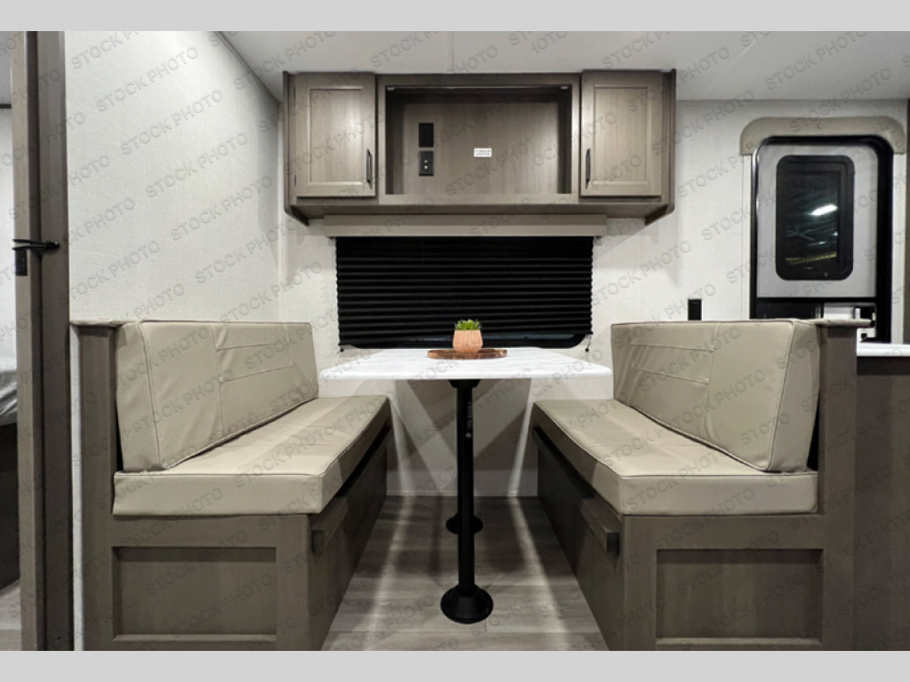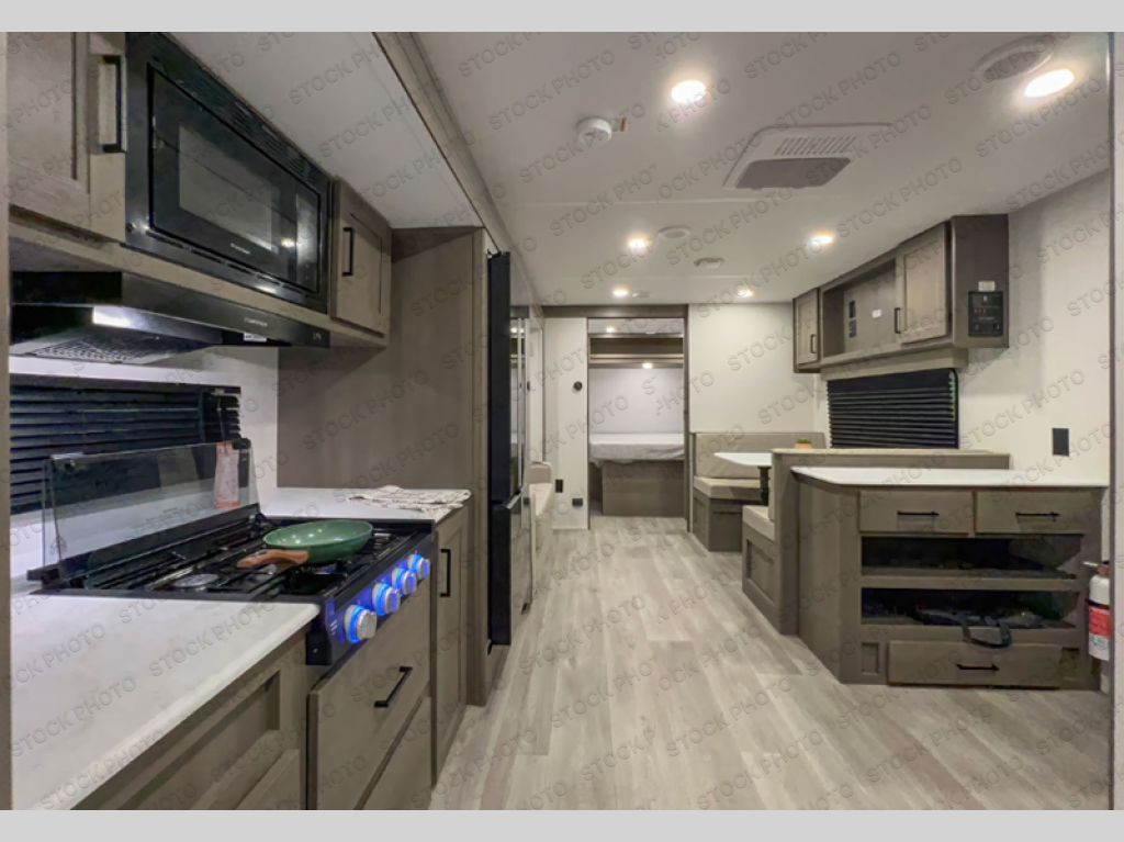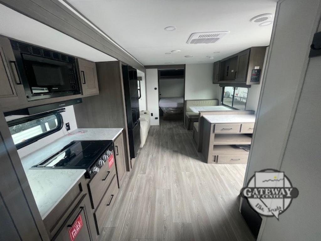It will be so easy to enjoy camping trips in this travel trailer for five to six! The main living area is made spacious by the large slide out, and here you'll find the 60" sleeper sofa and the kitchen appliances. A booth dinette across the room provides a place to dine and play board games, or you can head outdoors to sit under the 17' power awning with LED lights. The queen bed in the front private bedroom will have you feeling right at home, and the TV prep here gives you the option to watch movies in bed. This model also includes a rear corner kitchen with ample counter space and a large sink, and you'll find the full bath in the other rear corner!