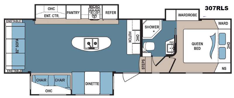 Along the rear wall find a sofa, two end tables and overhead storage the entire width of the unit. The entertainment center which is adjacent from the sofa also features a bit of storage overhead.