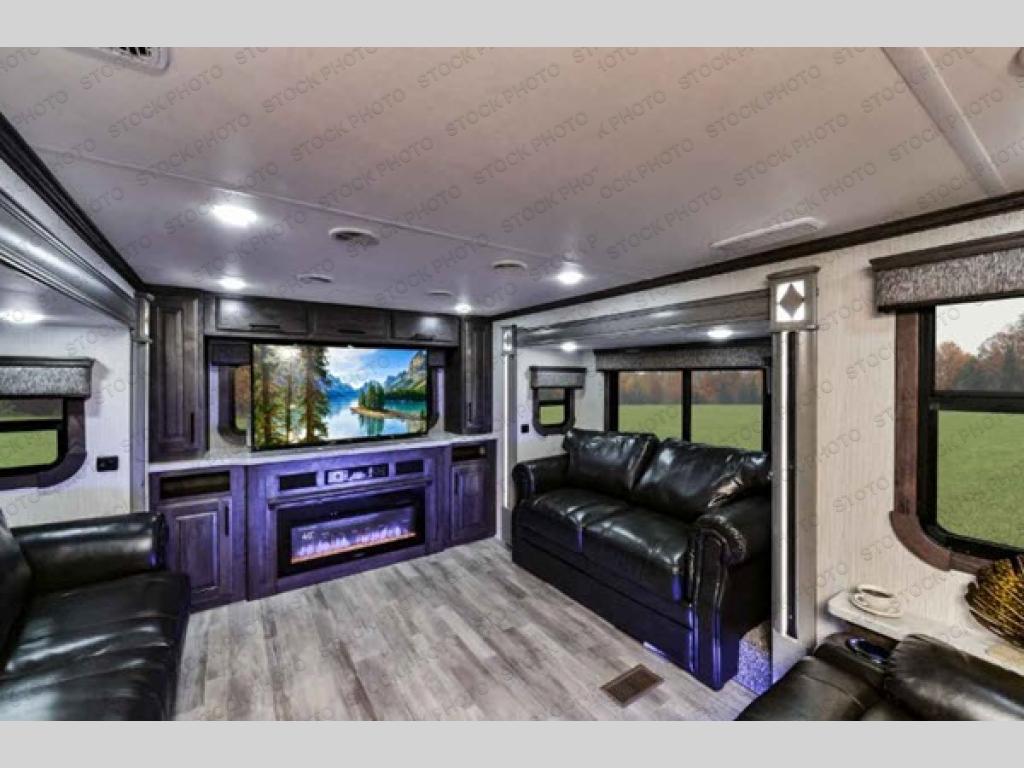 Once you step inside this Bighorn fifth wheel, you will be certain that you have found the RV for you! You'll find dual opposing slides in the rear living room and in the kitchen which create open and inviting spaces your whole crew will love. The kids can spend the day outside having fun, and the full bath will be ready for them to clean up before bed. They will love the separate living area that features a 55" LED HDTV, two sleeper sofas, and power theater seating. You can escape each night to the front private bedroom that includes a king bed and a built-in closet with hanging clothes rods and recessed shelving for all your belongings.